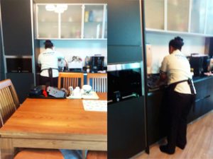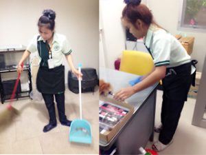 • เก็บกวาดขยะ• ดูดฝุ่นและทำความสะอาดประตูหน้าต่าง• ทำความสะอาดผิวโลหะและกระจก• ทำความสะอาดเฟอร์นิเจอร์และอุปกรณ์ต่างๆ• ทำความสะอาดด้วยน้ำยาทำความสะอาดพื้นโดยเฉพาะ• ทำความสะอาดห้องน้ำและห้องครัวด้วยน้ำยาทำความสะอาดและน้ำยาฆ่าเชื้อโรค• ทำความสะอาดรอยและคราบต่างๆบนพื้น